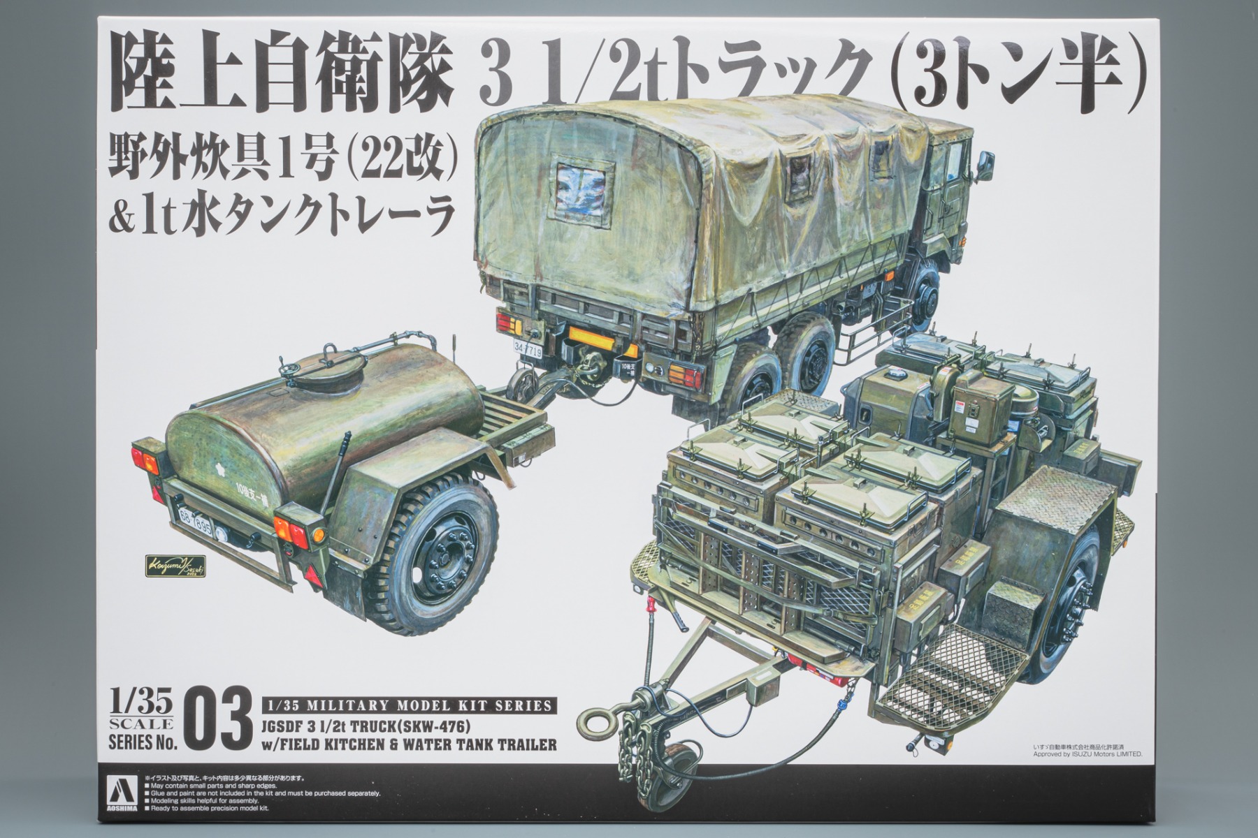 - Aoshima AO05891 JGSDF 3 1/2t Truck (SKW-476) + Field Kitchen + Water trailer, model kit 1:35€84.90 €68.47Add to CompareOut of stock